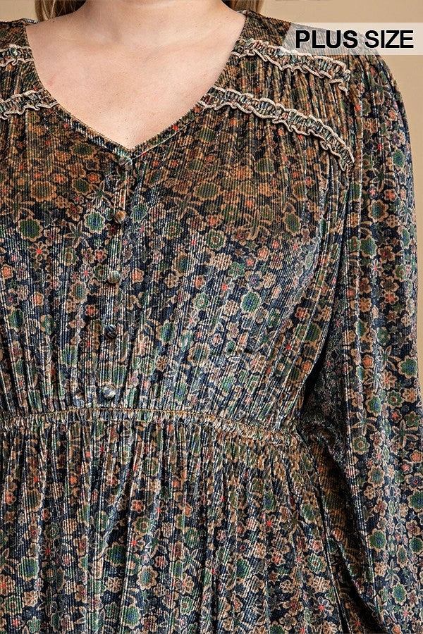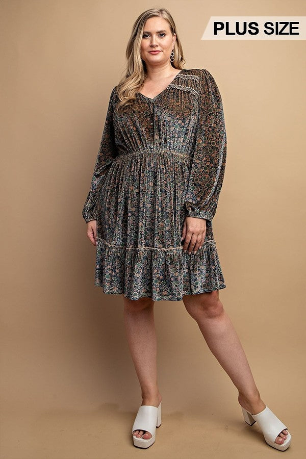 2-Printed Velvet V-neck Dress With Button Front Detail